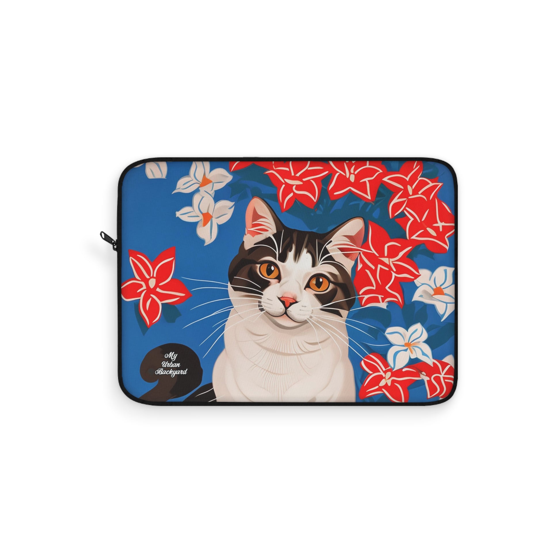 Cat with White & Red Flowers, Laptop Carrying Case, Top Loading Sleeve for School or Work