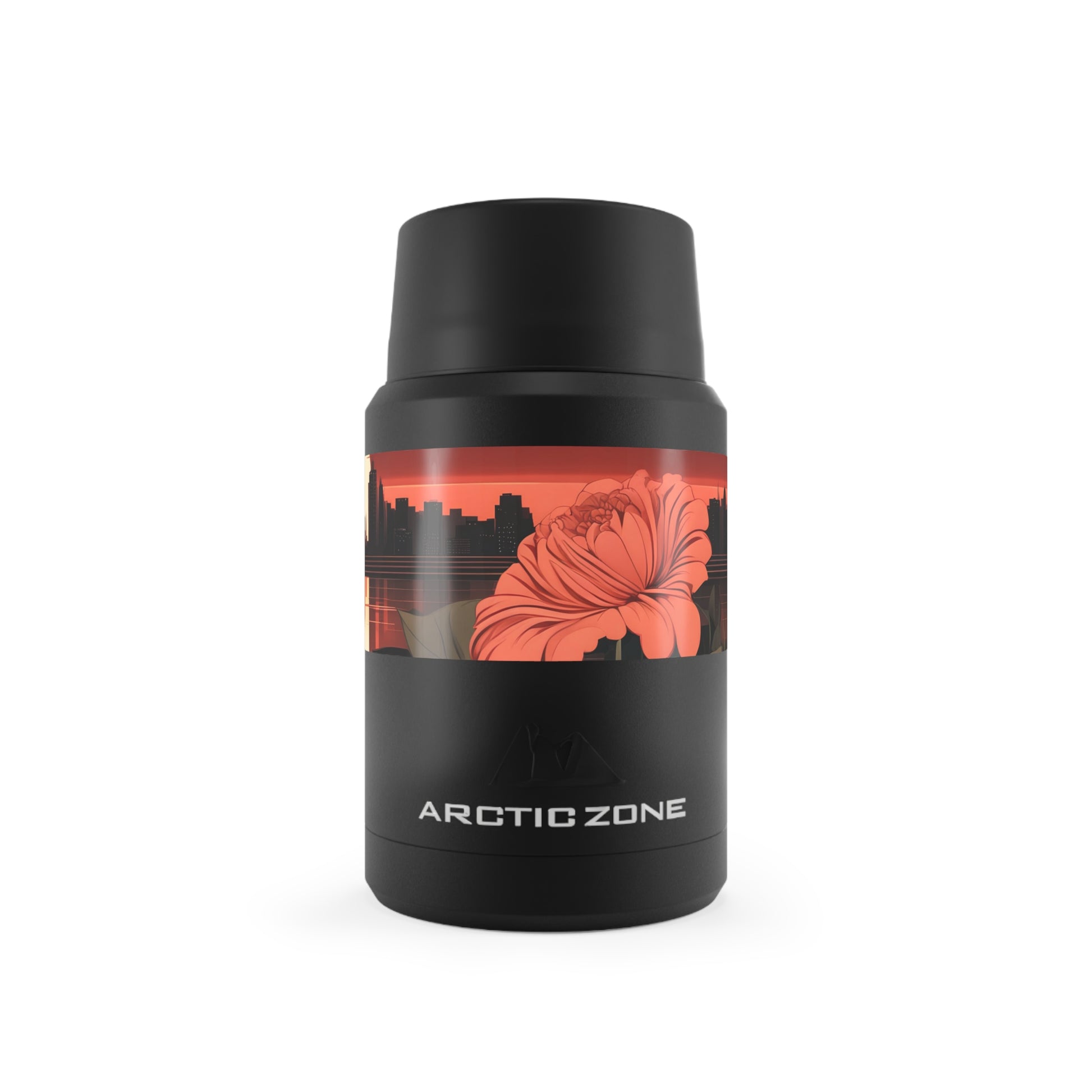 Urban Sunset with Red Flowers, Reusable Insulated Food Storage Container with Spoon – 16.9oz